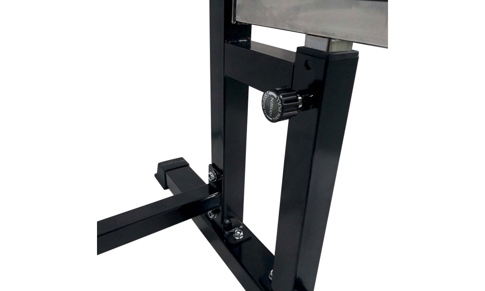 Тренажер со свободными весами. Позволяет выполнять широкий спектр упражнений со штангой. В комплекте поставляется прямая силовая скамья и силовая стойка для штанги. Стойки под штангу возможно установить на расстоянии 70 или 123 см друг от друга, и регулируются по высоте в диапазоне от 85 до 111 см. Рама стойки изготовлена из высококачественного стального профиля. Размеры: 50х70 и 50х50 мм, толщиной 1,5 мм. Однослойная покраска в черный цвет.