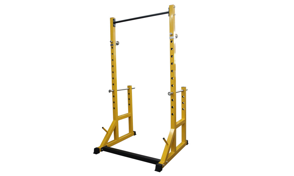 Тренажер со свободными весами. Позволяет выполнять приседания со штангой. Стойки под штангу регулируются по высоте. Есть места для хранения дисков диаметром 26 мм.